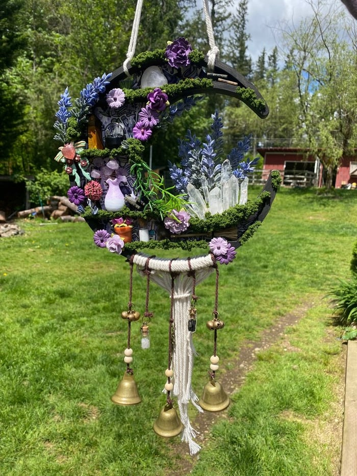 🙏Handcrafted with love. This enchanting hanging moon features a unique blend of rose quartz hearts, quartz points, obsidian-filled cauldrons, and earthy moss. Each piece is one-of-a-kind, infused with protective crystals and delicate faux florals to ward off negativity and bring mystical charm.